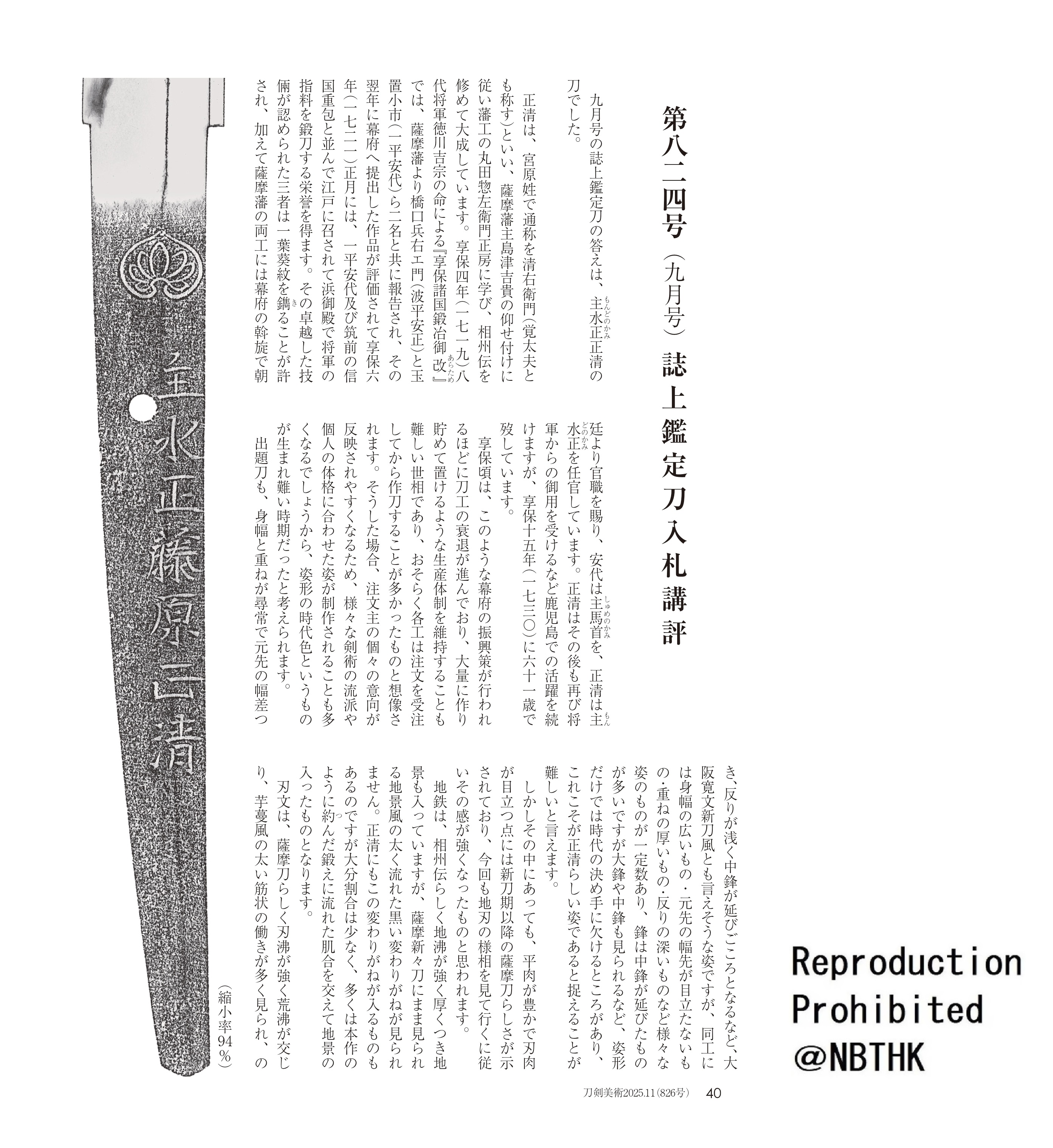 The answer for the Shijo Kantei To No. 824 in the September issue is a katana by Mondo no Kami Masakiyo.