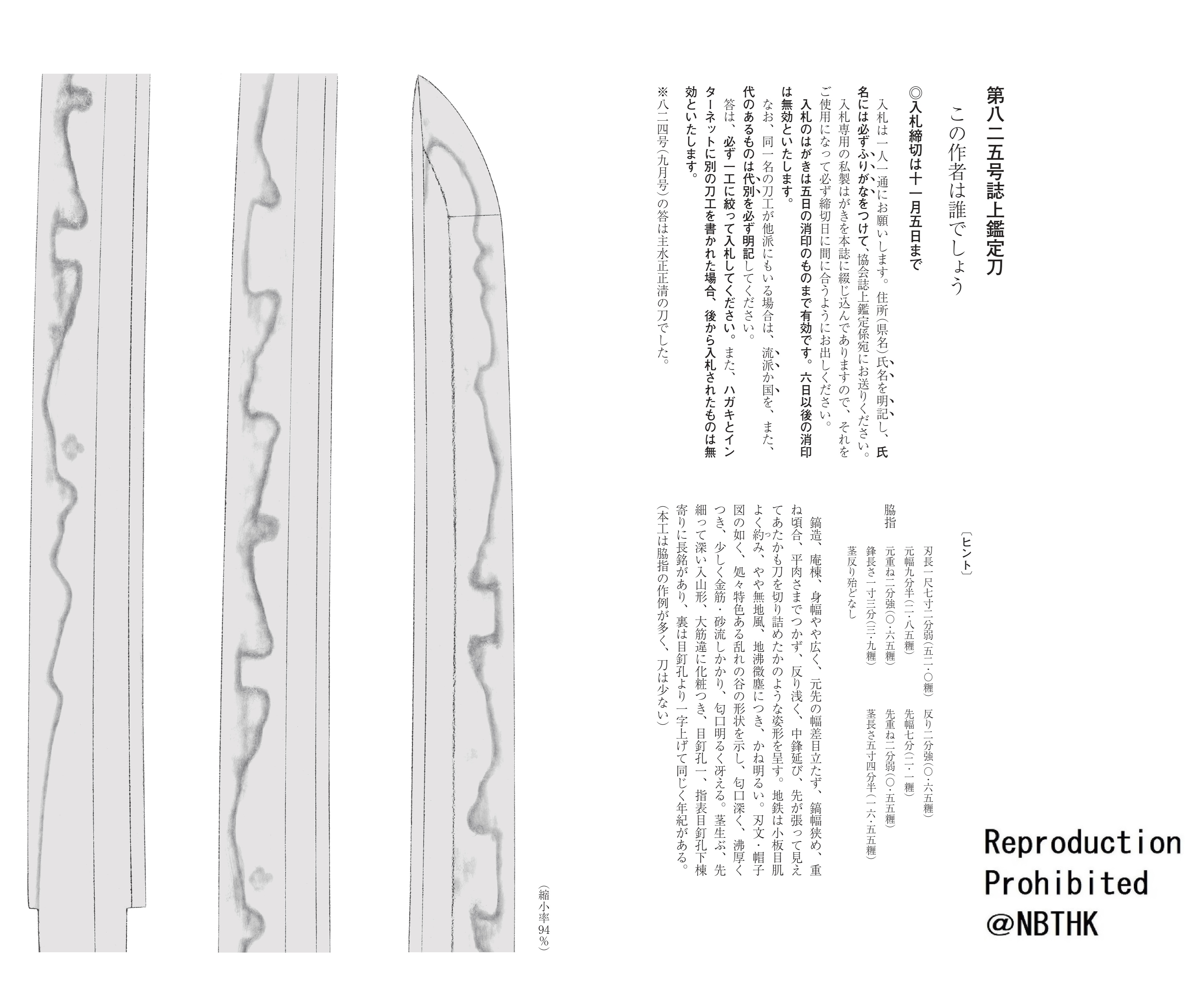 In voting, some people voted for Bo-Hizen smiths such as Masahiro, Yukihiro, Tadakuni, and the Osaka Shinto smith Shin-Kunisada. Among Hizen To, Tadakuni’s hamon have frequent midare, prominent kinsuji and sunagashi, and a bold and distinctive appearance. In his midare hamon work, his boshi are often midarekomi, and there is a long return. This is different from Tadayoshi’s style. The Bo-Hizen smiths Masahiro and Yukihiro’s boshi are often straight and follow the fukura, and are komaru with a return. Yukihiro sometimes has a unique choji hamon which looks like it is spread out horizontally, and this katana has a similar hamon, and if you consider this, you can vote for Yukihiro. But we thought it would be difficult to pick an individual smith’s name, and Bo-Hizen smiths’ names are treated as correct answers.